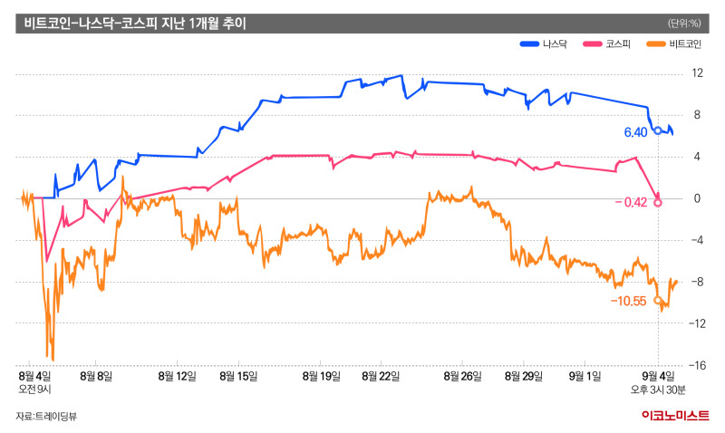 이런 비트코인의 흐름은 블랙먼데이 이후 곧바로 회복세에 접어든 주식 시장과 반대된다. 비트코인은 8월 4일 오전 9시 대비 9월 4일 오후 3시 30분 기준 가격이 10.55% 하락했다. 나스닥이 같은 기간 6.4% 상승한 것과 대조적이다. 코스피의 경우에는 0.42% 내렸지만 블랙 먼데이 직전과 거의 비슷한 수준을 유지했다.